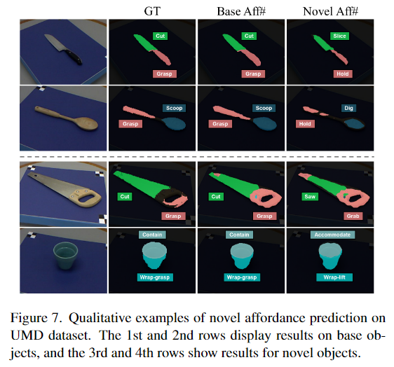 위의 Figure 7은 affordance에 변화를 주었을 때의 시각화 결과, Nove Aff#를 보시면 의미론적으로 유사하지만 Base와는 다른 Affordance로 추론이 이루어진 것을 확인하실 수 있습니다. 정량적 결과를 리포팅하기 위한 기준이 없어서 그런지 정량적 성능을 따로 리포팅되어있지는 않았습니다. 그러나 grasp 대신 hold, cut 대신 slice와 같이 의미론적으로 유사한 경우에 작동이 가능하다는 것이 굉장히 인상적입니다.