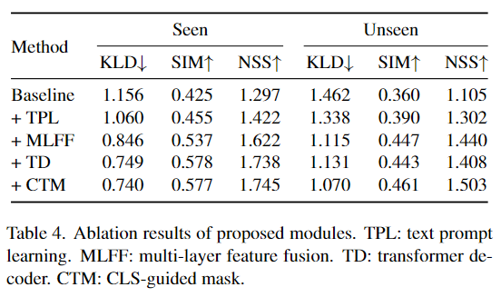 Table 4는 본 논문에서 제안된 방식에 대한 ablation 실험 결과로, 각 요소가 하나씩 추가될 수록 대체로 성능이 개선됩니다. 그러나 transformer decoder의 경우 seen 설정에서는 성능이 개선되지만, unseen에서는 성능이 저하되는 경향을 보입니다. 그러나 CLS-guided mask를 적용할 경우에는 두 설정에서 모두 성능이 개선되며, 이는 cross-attention과정에서 집중할 영역을 제한하므로써 unseen 객체에서도 효과적으로 작동한 것으로 분석합니다.