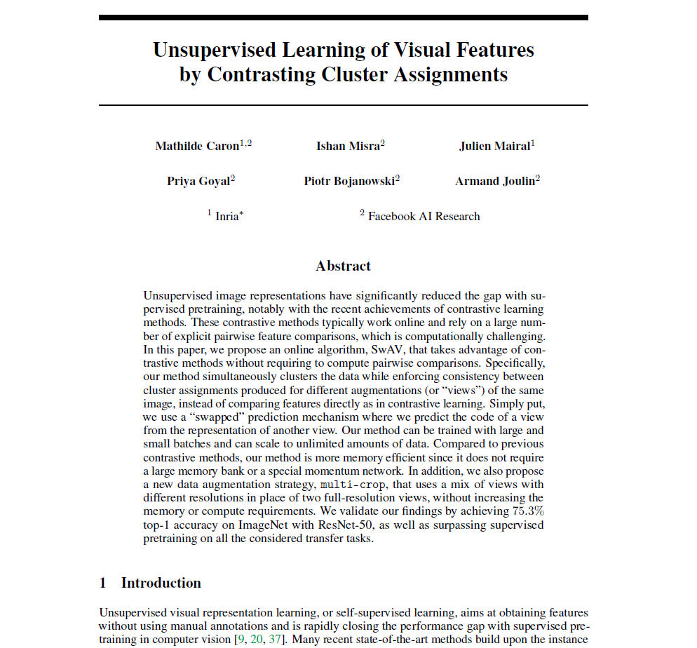 안녕하세요. 허재연입니다. 한동안 계속 Self-Supervised Learning쪽 논문을 읽고 있습니다. 이번에 다룰 논문도 image data의 visual feature를 어떻게 unsupervised방법으로 학습할 지를 다룬 visual representation learning 분야 논문입니다. Facebook에서 나온 논문으로, SSL 논문을 읽을 때 실험 부분에서 자주 등장하는 방법론이기도 하고 인용수도 높아서(24년 5월 말 기준 약 3580회) 읽어보게 되었습니다. 리뷰 시작하겠습니다.