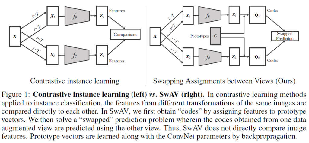 1. 이미지 데이터 하나하나에 대한 feature를 비교하는 instance discrimination이 아닌, 유사한 데이터가 군집화된 클러스터를 비교하거나, 해당 클러스터를 대표하는 code를 비교한 것이라는 뜻입니다.