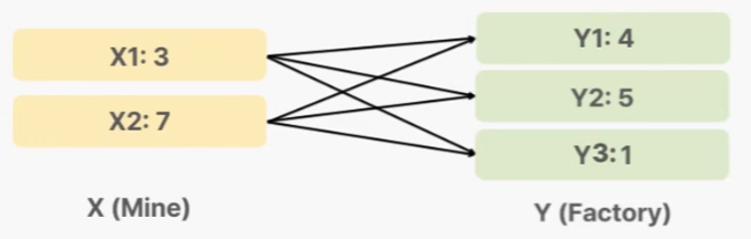 위 그림에서 마트 X1,X2가 있고, X1에는 매일 3개의 사과가, X2에는 매일 7개의 사과가 입고된다고 가정해봅시다. Y1,2,3은 각각 빵집인데, 사과파이를 만들기 위해 각각 4,5,1개의 사과가 필요합니다. 이 때 모든 마트의 사과를 모든 빵집에 운송하기 위애 어디서 얼만큼 어디로 운송할 지 매핑하는 전략에 관한 문제가 transportation problem이라고 한다고 합니다. 이를 본 논문의 매핑 전략에 대입해보면 다음과 같습니다 :