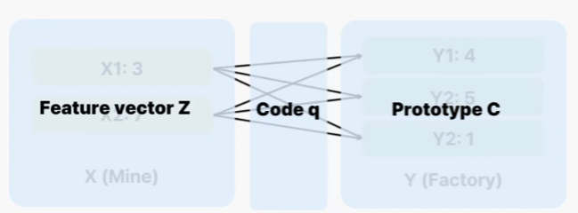 그런데 이해가 안가는 부분은 본문의 ‘Computing codes online’ 부분에서 마트와, 사과를 통해 예시를 들어주셨는데 이 그림에서는 X(feture vector z)를 Y(Prototype C)로 균등하게 배분하는 매핑(Code q)를 학습하는 것처럼 나와있고 설명해주신 부분에도 ‘cost를 고려하여 X에서 Y로 가는 최적의 transportation plan을 찾는 문제’라고 설명이 되어있습니다. 그래서 최종적으로 학습시키는것이 프로토타입 C인지 아니면 매핑(Code q)를 학습시키는 것인지가 궁금합니다.