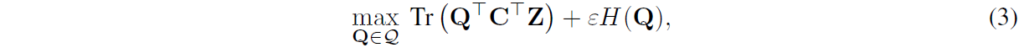 cost를 최소화하는 transport plan을 찾는것이 목표이며, 여기에는 Sinkhorn Algorithm이라는 알고리즘이 사용된다고 합니다. 최적화는 다음 식을 통해 진행됩니다 :