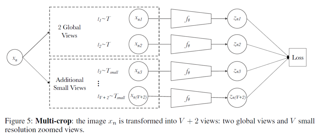 - 저자들은 추가적으로 큰 계산 및 메모리를 필요로 하지 않고 이미지의 view 수를 늘리는 multi-crop 전략을 소개한다