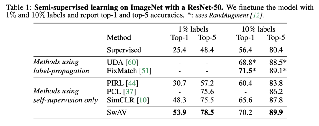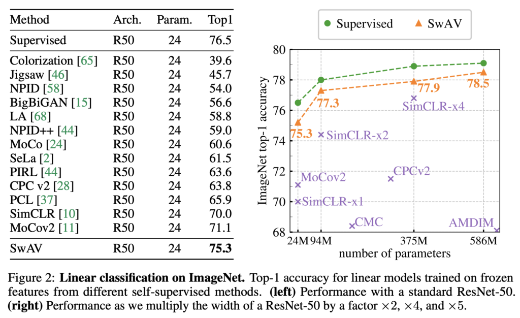 Figure2는 linear evaluation의 결과입니다. SwAV는 실험 결과 당시 SOTA였던 SimCLR를 4%가까운 성능 개선으로 제치고, supervised learning과는 1%정도의 차이를 보이며 거의 근접한 결과를 보였습니다.