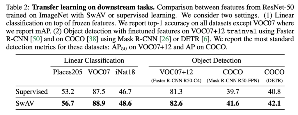 downstream task에 대한 transfer learning 실험에서는 VOC, COCO, Places205 등의 데이터셋으로 평가가 진행되었습니다. linear classification에서는 top-1 accuracy 및 mAP(VOC07)를, Object detection에서는 AP50(VOC)와 AP(COCO)로 평가했다고 합니다. 해당 실험에서는 모두 supervised feature보다 개선된 성능을 보인 것을 확인할 수 있습니다. 아무래도 classification에서 평가하는 것은 supervised learning 자체가 ImageNet에서 classification으로 학습된 feature이기때문에 supervised learning보다 약간 부족한 결과를 보였지만, 이외의 task에서 사용하기에는 충분히 좋은 representation을 학습한 것을 확인할 수 있습니다(OD에서 self-supervised learning을 제친 것이 SwAV가 최초인것은 아닙니다).