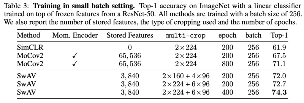 앞에서 SwAV의 장점이 큰 배치를 활용하지 않아도 되는 것이라고 언급했었는데, 이에 대한 실험 결과입니다. 작은 배치 환경에서 실험이 수행되었습니다. contrastive learning 방법론들은 negative pair의 수가 많아야 좋은 성능을 보이기에 SimCLR는 큰 배치 사이즈를, MoCo는 메모리 뱅크 및 momentum encoder network를 이용해 많은 pair를 확보했었습니다. 해당 실험 환경에서 SwAV는 적은 epoch 학습으로 SimCLR와 MoCo를 크게 능가하는 것을 확인할 수 있습니다.