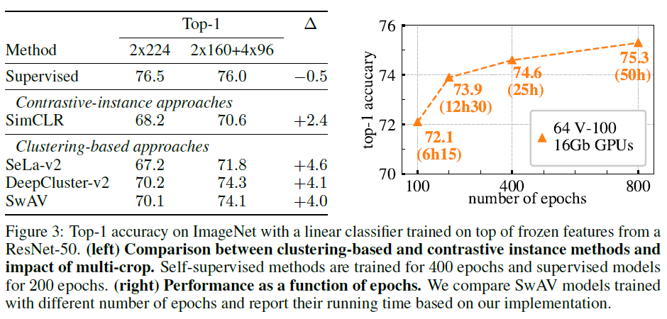 Fig3의 왼쪽에서는 contrastive-instance 방법과 clustering 기반 방법을 최대한 동등하게 비교하기 위해 세팅을 맞췄다고 합니다(data augmentation, 학습epoch, batch크기 통일 등). 해당 실험에서 SwAV와 Deepcluster가 multicrop의 유무와 관계없이 SimCLR를 능가한다고 합니다. 해당 실험은 instance classification 기반 방법론 대비 클러스터링 기반 방법론들의 포텐셜을 어필하기 위해 리포팅 한 것 같네요. 여기서 DeepCluster가 좋은 성능을 보이기는 하지만, SwAV와 달리 online learning이 불가능하다는 단점이 있음을 강조합니다.