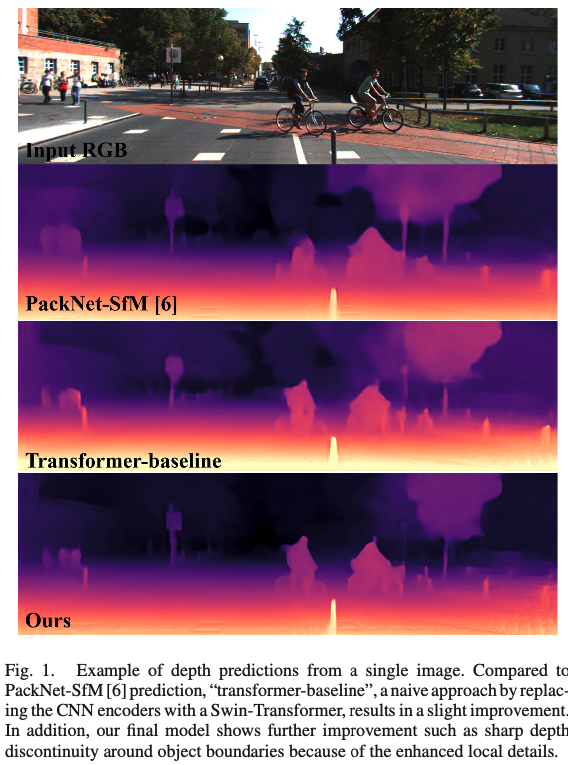 아까 언급했던 것처럼 Fig1에서 보이는 것과 같이 기존 Transformer-baseline은 fine detail을 예측하는데 한계가 있었습니다. 예를 들면 pole같은 thin structure와 물체의 boundary같이. 이건 다 local 정보의 부족 때문이었습니다. 또 다른 부수적인 optimizability 이슈는 transformer-baseline model이 학습하는 데 어려움이 있다는 점이었습니다. 그건 바로 multi-scale photometric loss로부터 온 noisy한 학습 시그널 때문이었습니다.