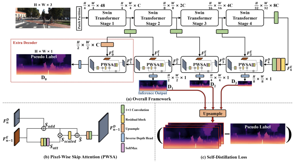 트랜스포머가 위와 같이 fine detail에서 이슈가 생기는 것을 해결하기 위해 본 논문은 self-supervised monocular depth estimation task에서 Swin-Transformer 인코더와 새로운 디코더 모듈인 PWSA를 활용한 더 나은 신경망을 학습하는 포괄적인 연구를 제시했습니다. 이 중 PWSA(Pixel-Wise Skip Attention)이라는 모듈은 트랜스포머 인코더의 global context를 효과적으로 유지하면서 local details을 잡기 위한 방법으로 제시했습니다.
