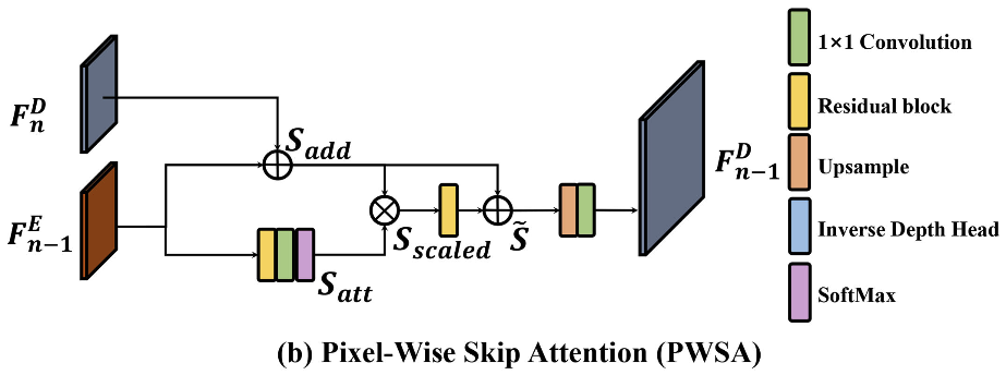 위 그림 1과 같이 로컬 세부 정보가 부족하기 때문에, 트랜스포머를 채택하는 것은 dense한 depth estimation 태스크에서는 사실 성능이 부족합니다. 그래서 본 논문의 목표는 디코더 feature map F^D_n에 풍부한 global 및 local context가 포함되도록 하는 것이기 때문에, 간단하면서도 효과적인 attention block인 PWSA(Pixel Wise Skip Attention)을 제안하고 이를 디코더 모듈로 사용하여 local detail 정보를 향상시킵니다.