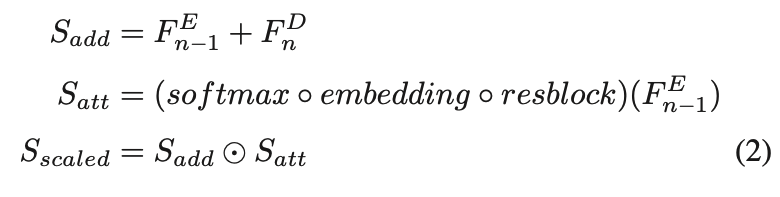 추가로, 학습의 초기 단계에서 rescaled 된 feature S_scaled 가 지나치게 강조되거나 무시되는 것을 완화하기 위해, attention 전에 S_scaled에 또 다른 resblock을 적용하고 fusion 된 feature인 S_add를 아래와 같이 추가하게 됩니다. 그 후에는 2배로 bilinear upsampling 하고 1*1 conv layer인 embedding을 거쳐 좀 더 향상된 output decoder feature map을 출력하게 됩니다.