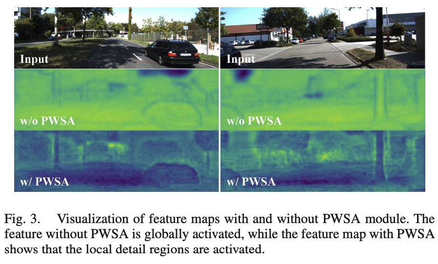 위 그림 3은 PWSA 모듈이 있고 없고의 feature map을 시각화한 것입니다.