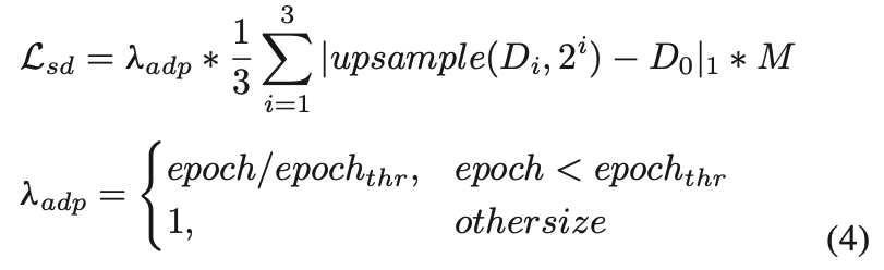 L1 loss는 upsampled prediction들과 수도 라벨 간의 loss를 계산하고 학습의 안정성을 위해, auto-mask M이 사용됩니다(monodepth2에서 언급된 auto-masking입니다.). 또한 훈련 초기 단계에서 Pseudo Label의 부정확성으로 인한 error propagation을 완화하기 위해, 학습 진행 동안 loss weights을 점진적으로 제어하는 adaptive weighting scheme인 λadp를 제안합니다. 다음과 같습니다.