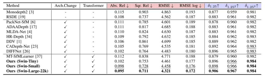 먼저 위 테이블은 KITTI eigen dataset 에 대한 결과입니다. 기존 방법론들과 비교해보면 우선, CNN 기반 self-supervised monocular depth estimation 방법론들인 [3],[19]보다 당연히 성능이 월등했고, attention 모듈같은 architectural change를 가진 [1], [4], [17], [23], [26] 과 비교했을 때도 성능이 높았습니다. 그리고 Transformer를 적용했던 기존 연구인 MT-SfMLearner보다 성능이 뛰어나며 SoTA 성능을 찍었음을 확인할 수 있었습니다.