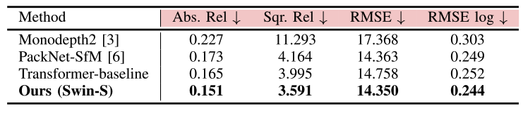 photometric loss는 weak한 학습 시그널로 알려져 있었습니다. 근데 이것에 의해 depth network를 최적화한다고 해서 항상 정확한 깊이 추정을 하는 것이 아니었습니다. 예를 들어, texture-less/occluded 영역과 움직이는 물체는 auto-masking 기법이 모델의 불안정한 학습을 완화할 수 있음에도 불구하고 깊이 추정 성능은 크게 향상되진 않았었습니다. photometric loss는 나이브한 transformer-baseline 아키텍쳐에 대해서 성능이 떨어지는 것으로 실험적으로 확인했다고 합니다. 학습 시의 트랜스포머의 불안정성으로 인해, 본 논문은 photometric loss로 인한 약한 학습 시그널이 트랜스포머가 정확한 중간 feature representation(예 F^E_n, F^D_n 등)을 학습하는 데 불리하다고 추측했습니다.