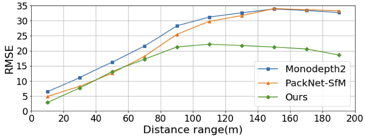 위의 그림은 각 방법론들에 대해 거리별 깊이 맵의 정확도를 비교한 그림입니다. TransDSSL 방법론이 40~60M를 제외하고 모든 거리에서 RMSE가 전반적으로 낮은 모습을 보여주고 있습니다. 특히 80~100미터 이상에서는 기존의 방법론들과 비교했을 때 큰 성능 차이를 보여주고 있습니다. 이는 중장거리의 object를 인식하는 데 있어서는 local context를 주로 보는 CNN 기반의 방법론이 썩 효과적이지 않았음을 방증하며, TransDSSL같이 트랜스포머 기반의 인코더 네트워크를 구성하여 Global Context modeling을 하면 전체적으로 일관성 있는 깊이 맵을 추정할 수 있기 때문에 효과가 있었던 것으로 추정됩니다.