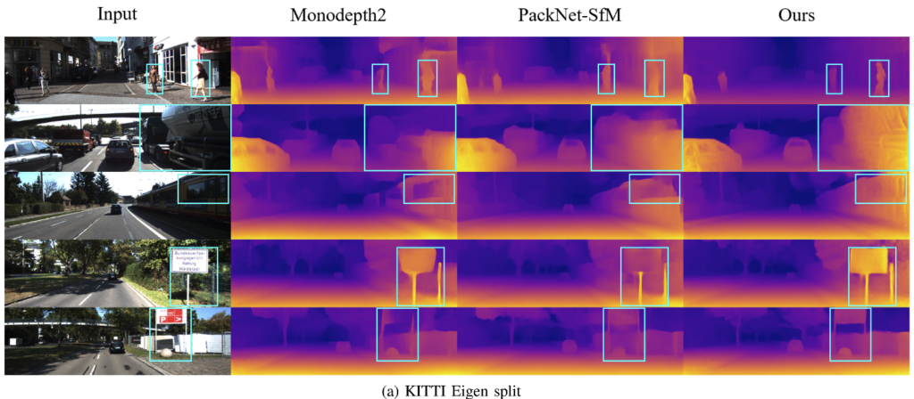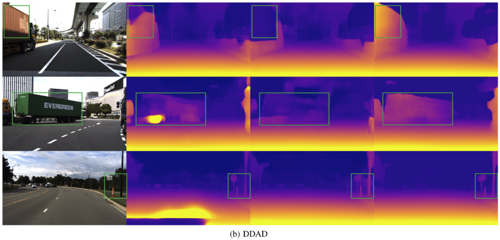 실험은 KITTI, DDAD 데이터셋을 사용했고, KITTI의 경우에는 기존의 monocular depth estimation에서 학습과 평가 시에 주로 사용하던 large-scale outdoor multi-sensor 데이터셋이고, DDAD의 경우에는 도심, 고속도로, 주거지역 같은 다양한 시나리오에 대한 미국과 일본에서 취득된 데이터입니다.