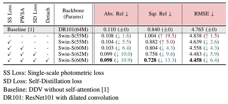 2번째 row는 encoder는 swin transformer를, decoder는 일반적인 residual block과 upsampling으로 구성된 디코더를 사용한 것입니다. 3번째 row에서 Single-scale photometric loss를 사용한 경우 multi-scale photometric loss를 사용하여 약한 supervision을 갖던 기존보다 성능이 조금 올랐고, 4번째 row에선 디코더 모듈을 PWSA 모듈로 변경하게 될 경우 local하고 디테일한 정보들을 더욱 잘 학습하게 되어 큰 성능 향상을 볼 수 있었습니다. 그리고 마지막으로 5번째, 6번째 row에서 순차적으로 SD Loss 및 Extra decoder detach를 사용하게 될 경우 점진적으로 성능 향상이 일어납니다. SD loss를 통해 중간 레벨의 깊이 맵들이 fine detail 정보들을 더 쉽게 최적화하면서 정확한 깊이 맵을 추정할 수 있음을 보여주고, extra decoder 를 제거하여 성능평가를 D_1의 depth map으로 하게 되면, D_0 depth map의 성능을 능가함을 보여줍니다. 이는 self-distillation loss가 highest resolution의 detail한 마지막 단의 depth prediction(D_0)을 앞단의 depth prediction(D_1,2,3)에 전이시키는 것이 목적이었기 때문에, 이를 supervision으로 삼은 D_1으로 평가한 성능이 더 좋게 나오는 것으로 보아 self-distillation loss가 잘 작동한 것으로 볼 수 있습니다.