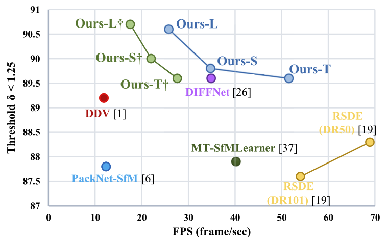 그리고 †가 없는 TransDSSL들은 Extra Decoder가 detach 된 모델들이고, 인퍼런스 시 수도라벨 depth map(D_0)으로 예측이 이루어지지 않고, 그 다음 작아진 resolution을 갖는 depth map(D_1)으로 예측이 이루어지는 모델을 의미합니다. 그래서 FPS는 기존 †있는 모델과 비교했을 때 향상되었지만 모델의 성능은 유사하게 유지하는 것을 볼 수 있어 이로써 모델의 효율성이 증가했음을 증명하였습니다.