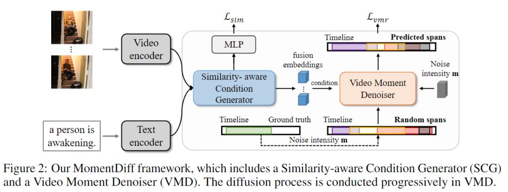 Figrue 2.은 MomentDiff의 전체적인 framework를 보여주는 figure입니다. 먼저 Video Encoder와 Text Encoder를 활용하여 프레임 수준 및 단어 수준의 feature를 추출합니다. 그런 다음 similarity-aware condition generator를 활용하여 텍스트와 시각적 특징을 융합하여 융합 임베딩으로 상호작용합니다. 마지막으로 융합 임베딩과 결합된 Video Moment Denoiser를 활용하여 무작위 노이즈로부터 정확한 시간적 목표를 점진적으로 생성하게됩니다.