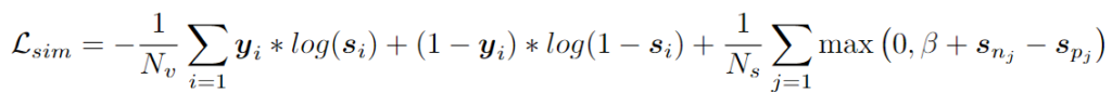 여기서 s \in \mathbb{R}^{N_v}는 유사성 점수이며, y \in \mathbb{R}^{N_v}는 유사성 라벨입니다. 여기서 i번째 프레임이 실제 시간 순간 내에 있으면 y_i는 1이고 그렇지 않으면 0입니다. s_{pj}와 s_{nj}는 각각 positive프레임과 negative 프레임입니다.