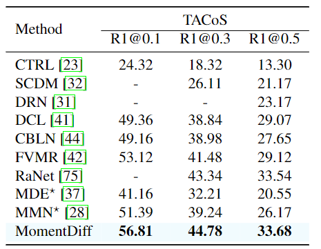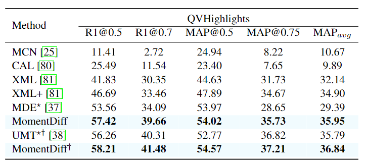 위 결과는 순서대로 Charades-STA, QVHighlights, TACoS 데이터셋에서의 Moment Retrieval 결과입니다. 기존의 다른 방법론들보다 모두 좋은 성능을 보여주는 것을 확인할 수 있습니다. 특히 저자는 TaCoS데이터셋이 조리기구, 음식 등 서로 다른 사건이 조금씩만 다른 긴 영상의 요리 영상이 존재한다는 점을 조명하고 있습니다. MomentDETR 기반의 방법론들은 이러한 fine-grained dynamic 변화에 약하다는 것을 지적하며 MomentDiff의 similarity-aware condition 정보와 점진적 노이즈 제거는 fine-grained 변화에 유리하다고 언급하는데 그에 따른 저자의 근거가 없네요. MomentDETR이 fine-grained dynamic 변화에 약하다는 것은 알겠지만, 왜 MomentDiff의 디퓨전 기반 방법론이 fine-grained에서 유리한지는 조금 더 생각해봐야할 것 같습니다.