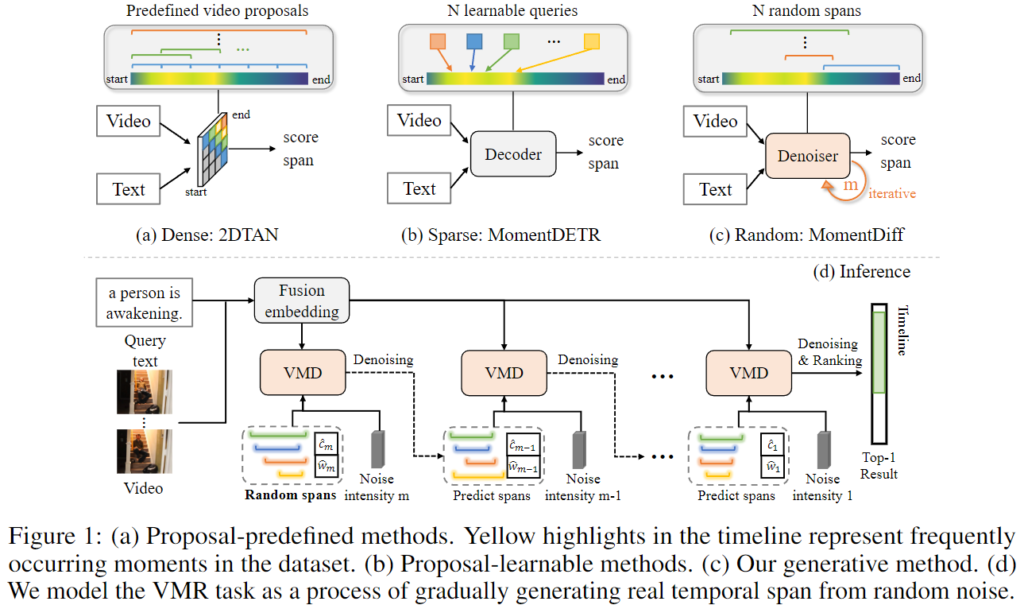 저자는 이러한 문제를 해결하기 위하여 VMR에서의 생산적인 관점을 제안한다고 강조합니다. 그림 1. (c)와 (d)에서 볼 수 있듯이 비디오와 해당 텍스트 쿼리가 주어지면 먼저 초기의 예측으로 여러개의 무작위 예측 범위를 도입합니다. 그 후에 무작위 범위를 반복적으로 개선하여 텍스트 쿼리와 비디오 프레임 간의 유사 관계에 대해 설명합니다. 이러한 방법은 인간이 영상 내에서 텍스트에 관련된 영상 내 구간을 찾는 방법과 비슷한 방법으로 영상이 주어졌을 때에 인간은 먼저 임의의 컨텐츠를 훑어보며 대략적인 위치를 파악한 우에 마지막으로 핵심적으로 의미적 순간에 반복적으로 집중하여 시간적인 좌표를 생성합니다.
