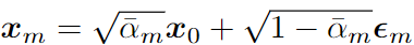 수식에서 노이즈 \epsilon \sim N(0,I)이고 \bar{\alpha} = \Pi^m_{i=1}(1-\beta_i)입니다. \beta_i는 분산\epsilon \sim N(0,I)이고 \bar{\alpha} = \Pi^m_{i=1}(1-\beta_i)입니다. \beta_i는 variance schedule로 Diffusion에서 가우시안의 폭을 결정하는 파라미터입니다.