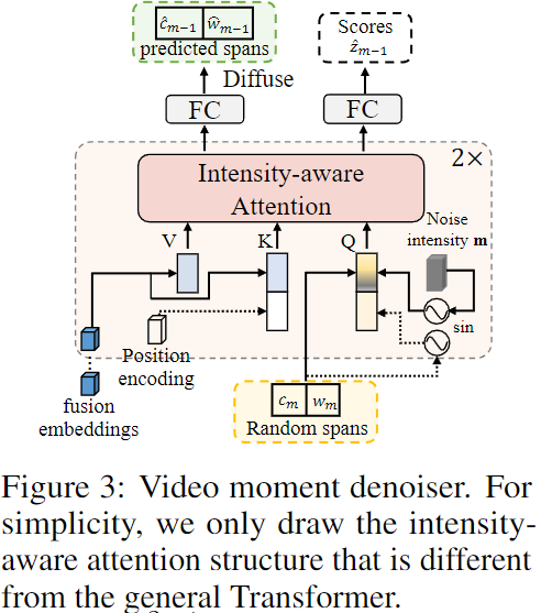 - Intensity-aware Attention: denoiser는 denoising 중에 추가된 노이즈 강도(m)를 이해해야 하므로, 저자는 강도 크기를 명시적으로 인식하는 강도 인식 어텐션을 사용합니다. Figure 3에서, 노이즈 강도 ?을 sine 매핑하여 다중 모달 공간에서 span embedding에 추가합니다. 저자는 쿼리 임베딩으로 투영하고 위치 임베딩을 sine 매핑합니다. x'_m=\mathbb{e}_m를 쿼리 임베딩 pos_m \in mathbb{R}^D를 포지셔널 임베딩으로 추영시킵니다. 그래서 최종 intensity-aware attention은 다음과 같습니다.