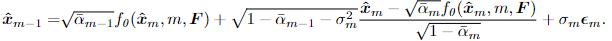 p_0(x_{m-1}|x_m) = N(x_{m-1};\mu_0(x_m,m),\sigma^2_m\mathbf{I})\sigma^2_m는 순방향에서의 \beta_m와 연관이 있고, \mu_0(x_m,m)는 예측 평균입니다. 해당 논문에서 저자는 span값을 예측하기 위해 nosining과 denoising과정을 거치기 때문에 기존의 Diffusion모델의 \mu_0(x_m,m)대신에 VMD네트워크 f_o(x_m,x,\mathbf{F})를 사용합니다.