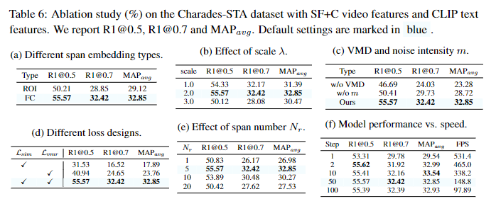 표 6. (a)는 이산 span을 임베딩 공간에 매핑하는 방법과 관련하여 ROI와 FC를 비교합니다. ROI의 경우, 퓨전 임베딩인 F를 슬라이스(분할) 한 후에 슬라이스된 특징에 대한 평균 풀링을 통해 진행했다고 합니다. ROI의 성능이 FC에 비해 많이 낮은 것을 확인할 수 있는데 저자는 이것을 ROI는 hard projection 전략이라고 하며 영상의 프레임별 중요성은 많이 다르기 때문에 좀더 soft한 방법인 FC가 더 좋다고 분석했으며 또 FC는 F(퓨전 임베딩)에서 분리되기 때문에 모델이 F에 과한 의존성을 띄는 문제를 예방할 수 있다고 분석했습니다.