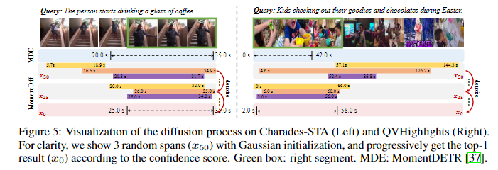 Figure 5.는 점진적으로 denoising을 거치며 MomentDiff가 정확한 timestamp예측을 하는 것을 보여줍니다. MomentDETR과 비교를 하며 점진적으로 noise를 제거하며 x_0 즉, noise를 전부 제거하고 난 이후에는 GT와 거의 일치하는 예측을 보여줍니다.