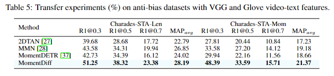 다음은 저자가 Introduction에서도 언급했었던 Charades-STA-Len과 Charades-STA-Mom을 포함하는 정답 구간의 위치가 데이터셋에 골고루 여러군데 존재하도록 수정한 데이터셋에서의 평가결과입니다. Charades-STA-Len은 원래 Charades-STA의 훈련 셋에서 w_0 \leq 10s인 페어를 전부 활용하고 w_0 \geq 10s인 훈련 셋은 일부만 활용하고 훈련 셋에서 활용하지 않은 데이터들은 모두 평가 셋에 추가한 데이터셋입니다. Charades-STA-Mom 데이터셋은 비슷하게 종료시간 c_0 + w_0/2 \leq 15s인 데이터는 전부 활용하고, 시작시간 c_0 - w_0/2 > 15s인 데이터는 일부만 활용하여 그 외의 데이터는 평가 셋에 추가한 데이터셋입니다. 두 데이터셋 모두에서 기존의 SOTA 모델보다 더 이러한 변화에 강인한 모습을 보이는 것을 확인할 수 있습니다. 저자는 위 표 4, 5를 강조하며 MomentDiff모델의 일반화능력이 다른 모델들에 비해 뛰어나다는 것을 강조합니다.