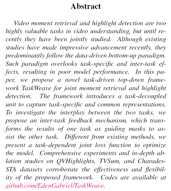 안녕하세요. 오늘의 X-Review에서 소개해드릴 논문은 2024년도 CVPR에 게재된 <Task-Driven Exploration: Decoupling and Inter-Task Feedback for Joint Moment Retrieval and Highlight Detection> 입니다. 우선 본 논문은 제가 계속해서 관심갖고 살펴보고있는 비디오 분야의 Moment Retrieval (MR)과 Highlight Detection (HD)을 동시에 수행하는 task를 다루고 있습니다. 직전에 리뷰하였던 Task-Reciprocal DETR (AAAI, 2024), 즉 TR-DETR이 두 task 간의 상관관계를 살펴보고 성능 향상을 위해 각자의 task가 서로에게 도움받다는 컨셉을 제시하고 그에 맞는 파이프라인을 구성했습니다. 이번 리뷰에서 소개해드릴 방법론인 TaskWeave도 이름에서부터 알 수 있듯 두 task 간 공통점, 차이점, 상호작용을 좀 더 명시적으로 모델링하여 성능을 올리게 됩니다.
