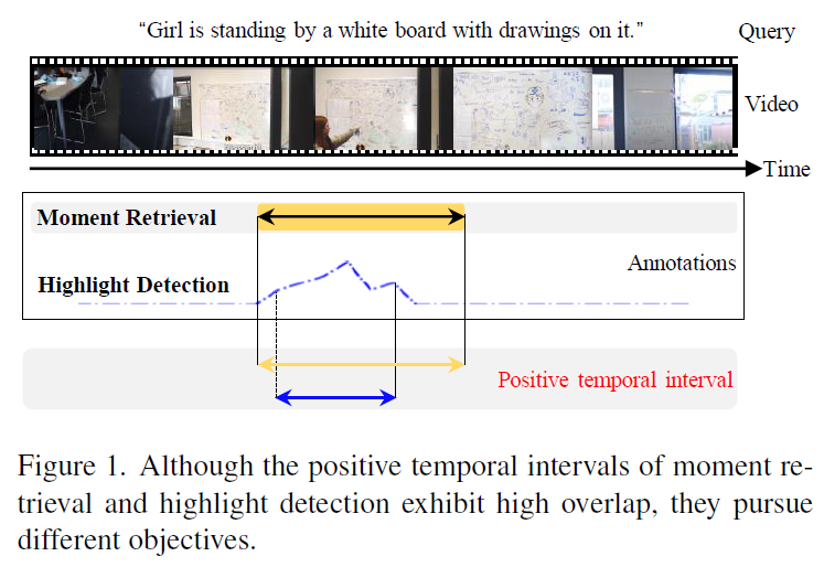 개인적인 생각으로 두 annotation의 구간이 겹치는 이유는, 유일하게 두 task를 동시에 수행할 수 있도록 annotation 되어있는 데이터셋인 QVHighlights에서 MR 상응 구간으로 이미 라벨이 붙은 비디오 clip에 대해서만 HD의 점수가 매겨져있기 때문인 것 같은데, 우선 두 task가 찾아야하는 목적에는 공통점도 있고 차이점도 분명히 존재한다는 주장으로 이해해볼 수 있습니다.