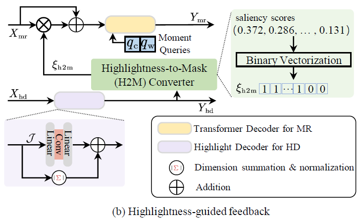 위 그림 3 – (a)가 해당 과정을 나타내며 처음에 얻은 MR 출력인 “(center, width)”를 “(start, end)”로 변환해줍니다. 변환된 구간들은 Moment-to-Mask (M2M) converter (그림에서 초록색 모듈)의 입력으로 들어가고 결국 moment-aware mask \xi{}_{m2m}을 만들어냅니다.