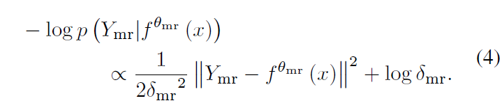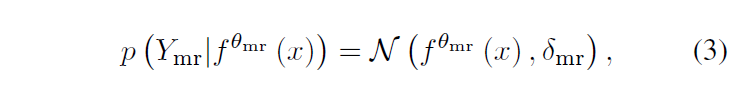 MR을 수행할 때 구간의 상응 확률을 Gaussian distribution으로 모델링합니다. 분포의 평균은 neural network의 출력 f^{\theta{}_{mr}}(x)가 됩니다. 분포의 분산이자 uncertainty 값인 \delta{}_{mr}은 learnable parameter입니다.
