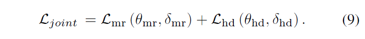 최종적인 joint loss \mathcal{L}_{joint}는 아래 수식 (9)와 같이 두 loss의 합으로 구성됩니다. Task-specific한 모듈들을 앞서 계속 제안했기 때문에 loss에 대해서도 task 서로 간의 출력을 명시적으로 활용해주나 기대하였는데, 실질적으로는 learnable parameter \delta{}_{mr}, \delta{}_{mr}를 uncertainty로 삼아 학습에 기대어 각 task 별 loss balancing weight를 조절해주고 있는 모습입니다.