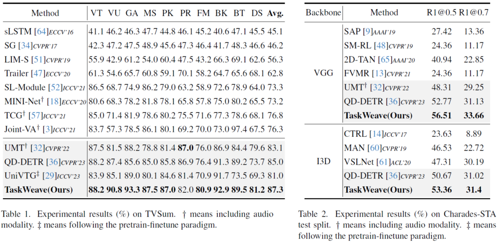 지난번에 리뷰하였던 TR-DETR에 이어 비디오 도메인의 모델링에 치중하기보단 두 task간의 특성을 성능 향상에 활용하는 방법론 TaskWeave에 대해 알아보았습니다. 최근 DETR 기반의 joint MR&HD 방법론들을 쭉 follow-up 하다보니 결국은 Transformer encoder-decoder에 입력되는 feature를 어떻게 모델링할 것인가가 주요 관심사인 것 같고, 일부 TR-DETR이나 TaskWeave 같은 방법론에서 고정적인 DETR 구조를 깨려는 듯한 시도를 보여주는 것 같습니다.