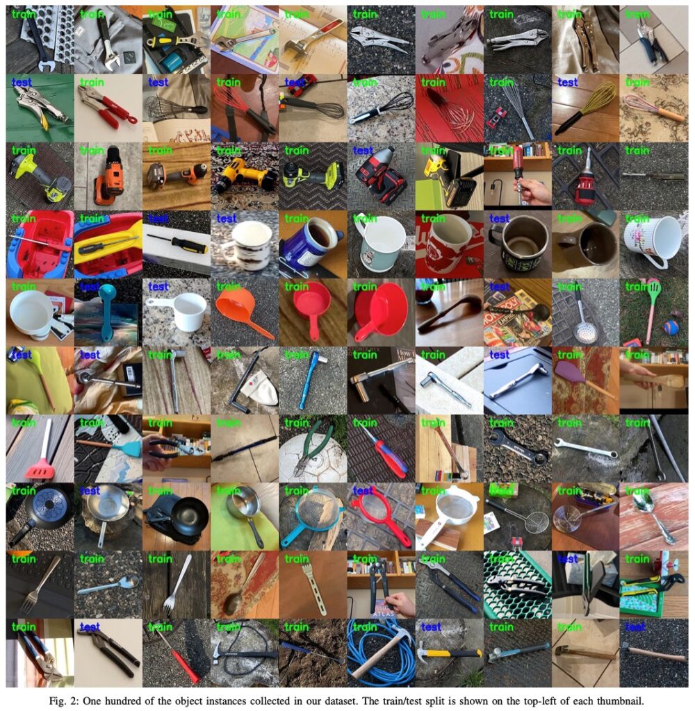 그림(2)는 데이터셋의 샘플 이미지를 나타내고 있습니다. 각 카테고리별로 최소 12개의 서로 다른 물체 인스턴스로 구성합니다. 즉, 브랜드나 크기가 다른 물체들로 구성하여 총 17개의 카테고리에서 총 212개의 물체들로 구성하였다고 하네요. 각 물체에 대해 다양한 조명 조건, 배경, 다양한 방해 요소가 있는 환경에 놓인 물체에 대해 정적인 상태로 약 10개의 정적 장면을 촬영했다고 합니다.