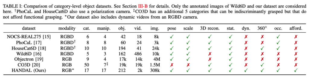물체의 조작 가능 여부를 결정하는 것은 다소 저자의 주관적인 판단으로 보이는데요. 위 표에서 NOCS-REAL275, Wild6D, Objectron에서 제공하는 cam, notebook 카테고리는 깨지기 쉽고 교체 비용이 많이 드는 이유로 포함하지 않았다고 합니다. Objectron에서 제공하는 bike, chair 카테고리는 너무 커서 포함하지 않았다고 합니다. CO3D에서 제공하는 사과, 당근 오렌지, 바나나, 공 카테고리는 기능적인 파지를 알 수 없으므로 포함하지 않았지만, pick-and-place를 고려한다면 포함할 수도 있겠네요.