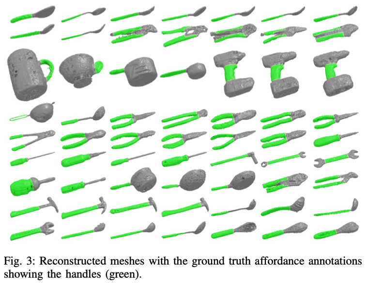 그림(3)과 같이 affordance의 경우는 각 물체에 대한 reconstruction에서 3D mesh의 handle 영역에 대해 수동으로 라벨링을 진행했다고 합니다.