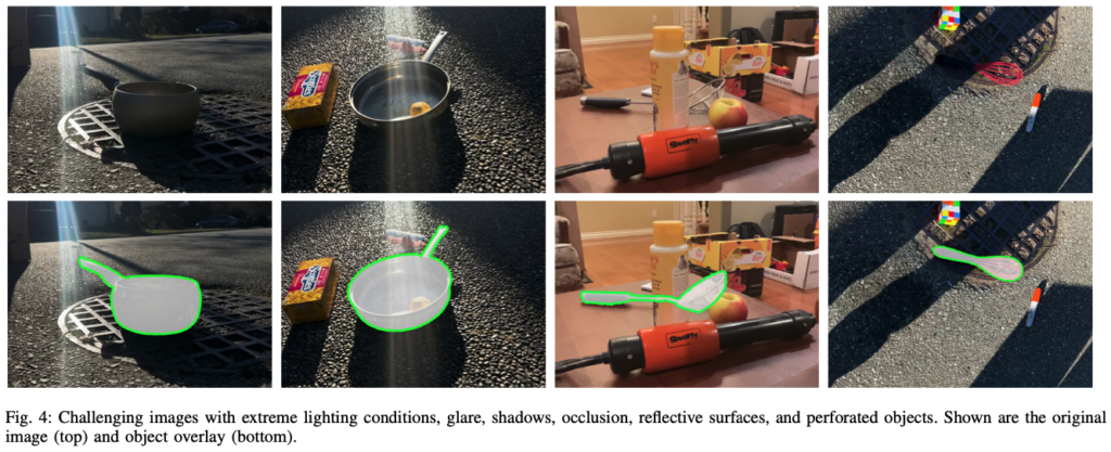 반사가 되는 표면, 구멍이 뚫림 등과 같은 다양한 재질과 형태로 물체들이 구성되어 있는데요. 이러한 특성으로 인해 발생하게 되는 문제점은 실제 시나리오를 다루는 인지 연구를 발전시키는 데에 HANDAL 데이터셋이 유용하게 활용이 될 수 있을 것으로 보이네요.