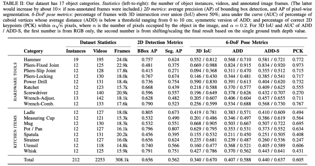 2. 데이터셋의 유효함을 검증하는 것 자체가 주관적일 수는 있으나, 2D detection / 6D pose estimation 자체에 대한 성능을 뽑아봤을 때 표(2)만큼의 정량적인 결과가 나왔고, 결과를 보았을 때 결코 쉬운(saturation된) 데이터셋은 아니라고 보이며, 앞으로의 연구 방향이 해당 데이터셋에서 얻은 베이스라인을 가지고 좀 더 고도화를 위한 방향으로 나아가도록 제시한 것으로 볼 수 있을 것 같습니다.