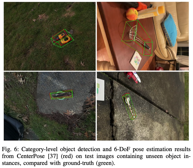 해당 데이터셋의 검증을 6D pose estimator로 한 내용을 살펴보겠습니다. 결과를 보았을 때 category-level pose 추정을 학습할 수 있다는 것을 일단 보여주고 있습니다. pose estimator로는 RGB 기반의 CenterPose[2]를 사용했다고 하네요. pose의 범위가 매우 다양하기 때문에 물체의 세로축과 이미지의 세로축을 가장 잘 정렬하는 90도 단위로 이미지를 회전하고, GT 물체의 스케일을 알 수 있다는 가정합니다.