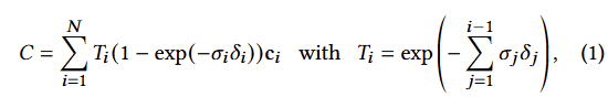 여기에 density ?, transmittance ?, color c에 대한 샘플들은 intervals ??에 따라 ray 따라 취해집니다. 이는 아래와 같이 정리됩니다.