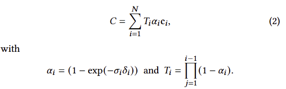일반적으로 신경망 기반의 point-based 방법론들은 아래와 같이 픽셀과 겹치는 N 개의 정렬된 포인트를 혼합하여 color C를 계산합니다.