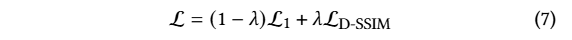 초기 가우시안은 각 축의 값이 동일한 isotropic Gaussian이라고 가정합니다. standard exponential decay scheduling을 사용하지만 position에 대해서만 사용됩니다. 또한, loss는 L1과 D-SSIM을 사용합니다. 이는 아래와 같습니다.