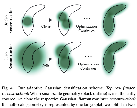 저자가 목표하는 적응형 컨트롤은 빈 영역도 채워야만 합니다. 여기서는 기하하적 특징이 누락된 영역 (under-reconstruction)과 가우시안이 장면에서 넓은 영역을 덮는 영역 (over-reconstruction)에 초점을 맞춥니다. 저자는 두 요소 모두 높은 view-space positinal gradients를 가지고 있는 것을 확인하였다고 합니다. 직관적으로 아직 구성되지 못한 혹은 재현하지 못하는 영역에 대해 수정하기 위해 가우시안을 이동시키려고 하기 때문이라고 합니다.